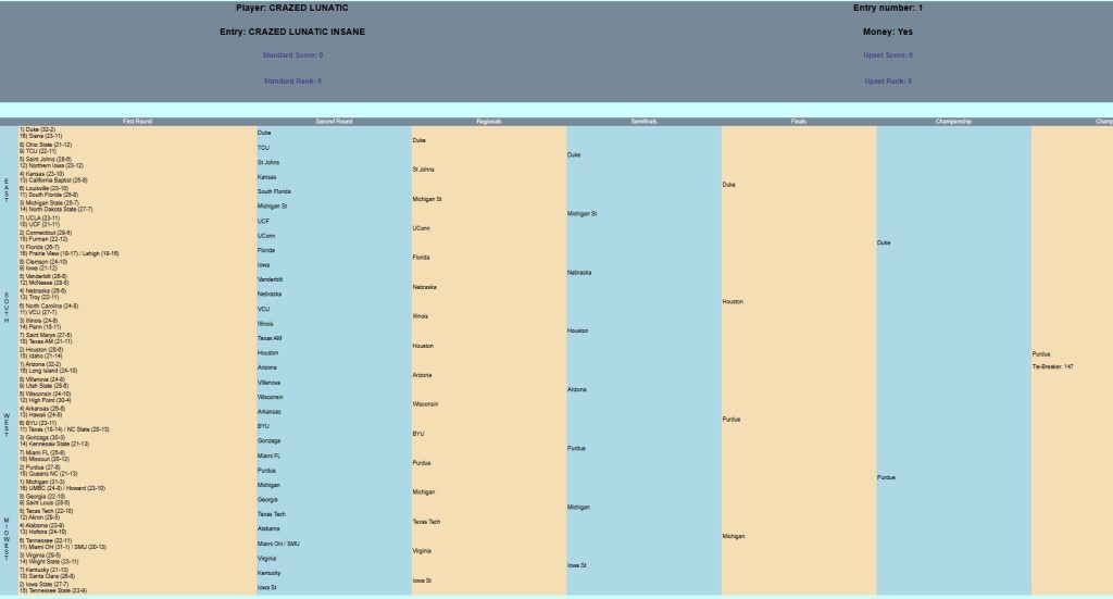 So, as the Lunatic goes through his check-list (that only exists in his head which probably explains why he is so far behind). He needs to pick all the games (and at least get Thursday’s games by the spreads – which is a lot harder than simply picking that the #1 seed will beat the #16 seed).